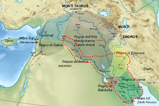 Ai confini troviamo i regni di Yamkhad con capitale Halab (Aleppo) e Qatna situata vicino all’odierna Homs, dominati da dinastie amorree in costante lotta tra loro, e a oriente il regno elamita incentrato sulle città di Susa e di Anshan. Completa il quadro il regno di Larsa, nella Mesopotamia meridionale, in cui dal 1830 a.C. la precedente casa amorrea è stata spodestata da una dinastia probabilmente proveniente dal regno elamita di Ashan sull’altipiano iranico.
