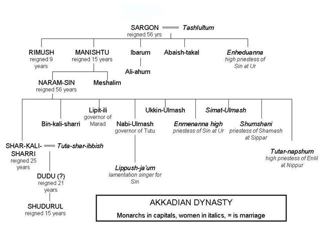 La figlia Enheduanna non si limita a rappresentare il padre quale somma sacerdotessa di Ur. Donna colta e raffinata, crea un centro di potere parallelo a quello del padre, sostenendone in ambito religioso le istanze imperiali. Tra le molte composizioni letterarie che le vengono attribuite – facendone la prima autrice identificabile nella letteratura mondiale – troviamo una serie di inni dedicati agli dèi poliadi di trentacinque città mesopotamiche, chiaro tentativo di inglobare i vari culti in un unico sistema integrato e funzionale al nuovo impero. La sua azione è talmente efficace che per i cinque secoli successivi il controllo del sommo sacerdozio di Nanna a Ur sarà uno degli obiettivi di chiunque lotti per la sovranità della regione.
