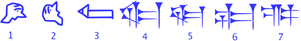 Compare ben presto lo strumento indispensabile dello scriba: lo stilo. È una canna sottile, smussata in punta che lascia sull’argilla fresca un segno a forma di cuneo. La necessità di ridurre lo spazio occupato sulla tavoletta, di standardizzare i segni e (probabilmente) di accelerare l’atto dello scrivere portano a stilizzare sempre più la loro forma. Ecco come è stato disegnato il pittogramma “testa” nel corso di varie fasi storiche (Borger).
