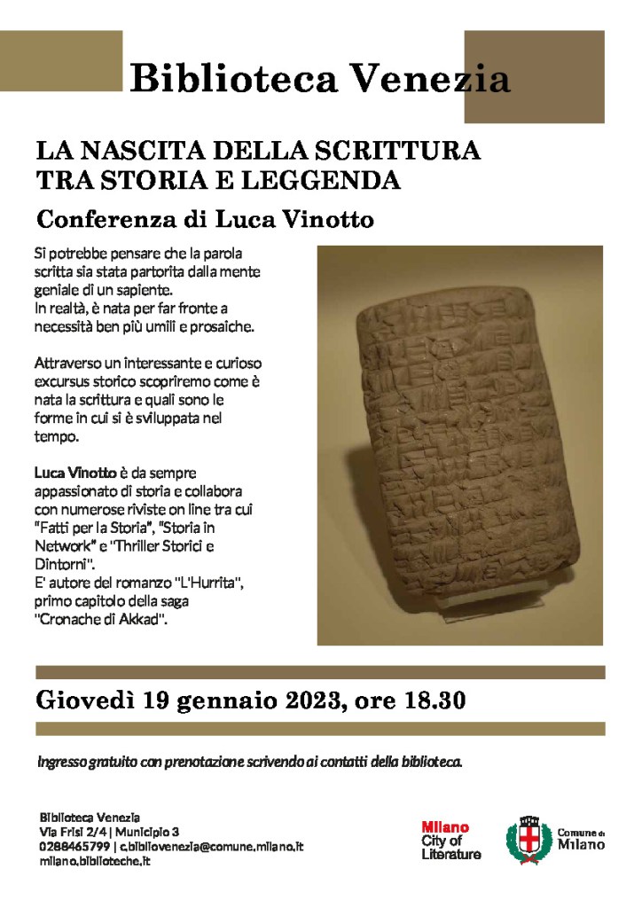 Giovedì 19 gennaio, presso la Biblioteca municipale di P. Venezia a Milano vi rivelerò la storia curiosa e sorprendente di una delle “invenzioni” fondamentali della Storia umana: quella della scrittura.