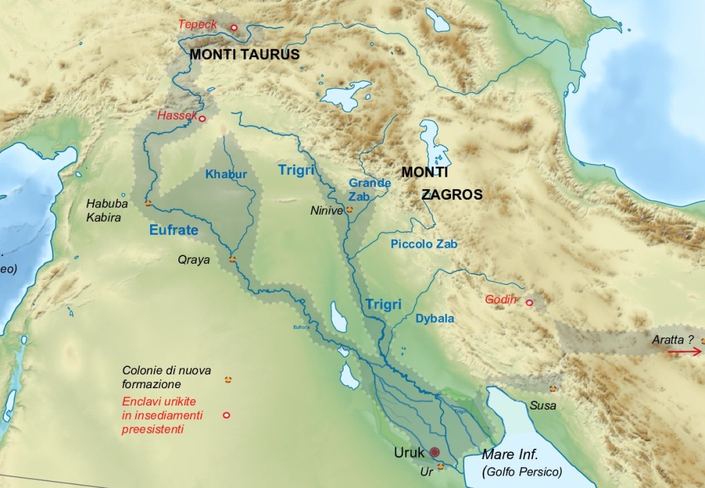 Si potrebbe pensare allora che siano il prodotto di una fase involutiva durante il quale le tecniche di lavorazione sono regredite, ma non è vero. Quello di Uruk è anzi un periodo di grande espansione. Vede la fondazione della città di cui prende il nome, la prima nella storia dell’umanità, una “megalopoli” che già alla fine del IV millennio a.C. raggiunge i 50.000 abitanti e dimensioni di gran lunga superiori a città molto più recenti, come l’Atene di Pericle. Un centro che estende la sua influenza a tutta la regione, dando vita ad altri importanti insediamenti distribuiti lungo il corso del Tigri e dell’Eufrate (vd cartina in basso).