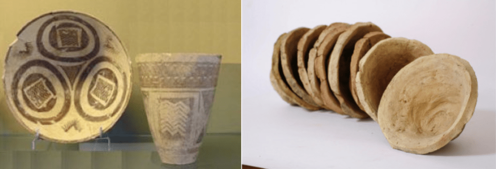 Ebbene, vi sbagliereste. La bella scodella e il vaso decorati risalgono al VI millennio a.C., alla “cultura Ubaid” . Le ciotole risalgono alla “cultura di Uruk”, di circa mille anni più tarda (3800 – 3100 a.C.).